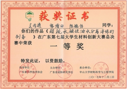 近日,由广东省材料研究学会主办,中山大学承办的广东第七届大学生材料创新大赛总决赛落下帷幕。经过各分赛区决赛和总决赛的激烈角逐,我校材料科学与工程学院黎增田、吴浩通、陈婉仪三位同学的参赛作品“超疏水磁性油水分离海绵的制备”(指导老师:何富安研究员)获得高分子分赛区一等奖和总决赛本科组一等奖的优异成绩。