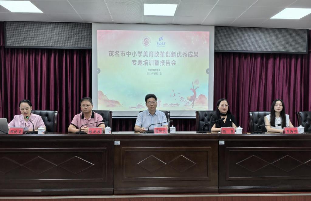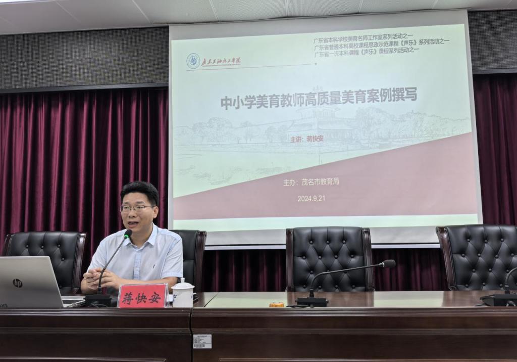 9月21日,广东石油化工学院纵向帮扶茂名市“三所学校”和县中质量提升暨茂名市中小学美育改革创新优秀成果专题培训活动在市教育局四楼会议室成功举办。省本科学校美育名师工作室主持人、艺术学院副院长蒋快安教授,省名教师工作室主持人陈燕校长,市教育局体卫艺科科长陈光东,以及茂名市近100名大中小学美育骨干教师等参加活动。