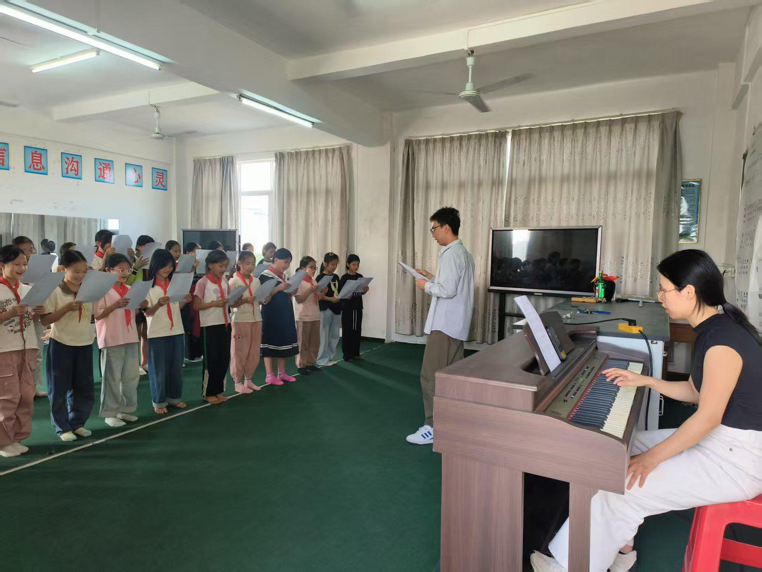 合唱教学环节,张绮莹老师为孩子们带来了一场别开生面的合唱艺术课。冯一龙同学通过生动有趣的教学方式,带领孩子们走进合唱艺术的美妙世界。冯一龙同学首先通过精心准备的视频资料,向孩子们展示了合唱艺术的独特魅力。张绮莹老师则用钢琴为孩子们进行音准训练,耐心地纠正每一个音符,确保合唱的和谐统一。她一边弹奏一边指导,孩子们聚精会神地跟着调整,教室里回荡着清澈悦耳的童声。