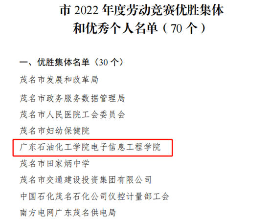 日前,茂名市劳动竞赛委员会公布了《2022年度劳动竞赛优胜集体和优秀个人名单》,电子信息工程学院被评为“茂名市2022年度劳动竞赛优胜集体”,这是全院教职工团结奋斗收获的光荣勋章。