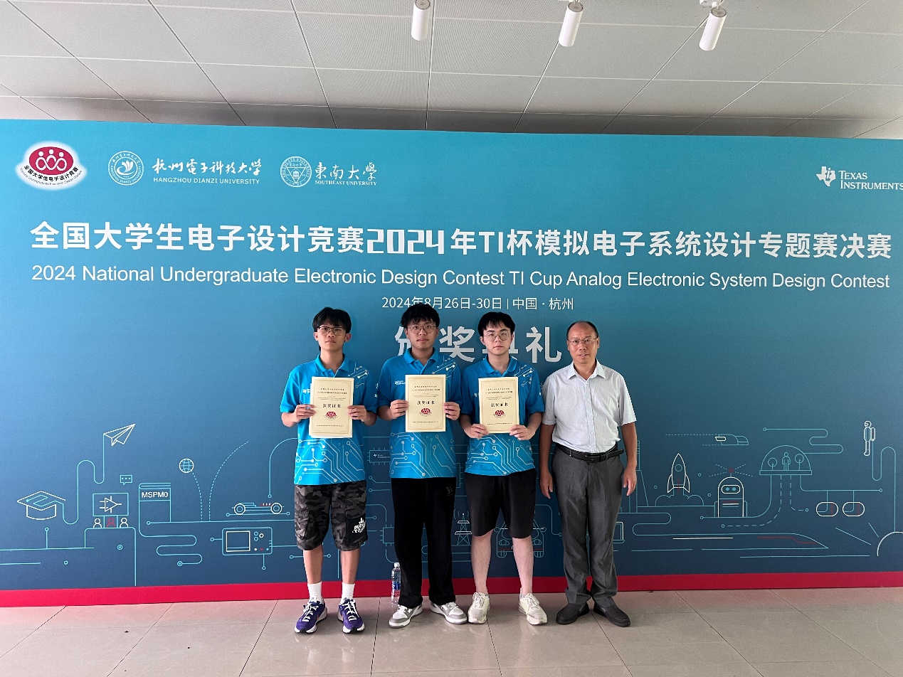 8月26日至30日,2024年全国大学生电子设计竞赛模拟电子系统设计专题赛(TI杯)在杭州电子科技大学举行。广东石油化工学院参赛队(成员:陈政辑、黄群斌、李骏霖,指导教师:方波、张锋)首次参加该项赛事并荣获全国决赛三等奖,实现我校参与该项赛事零的突破。