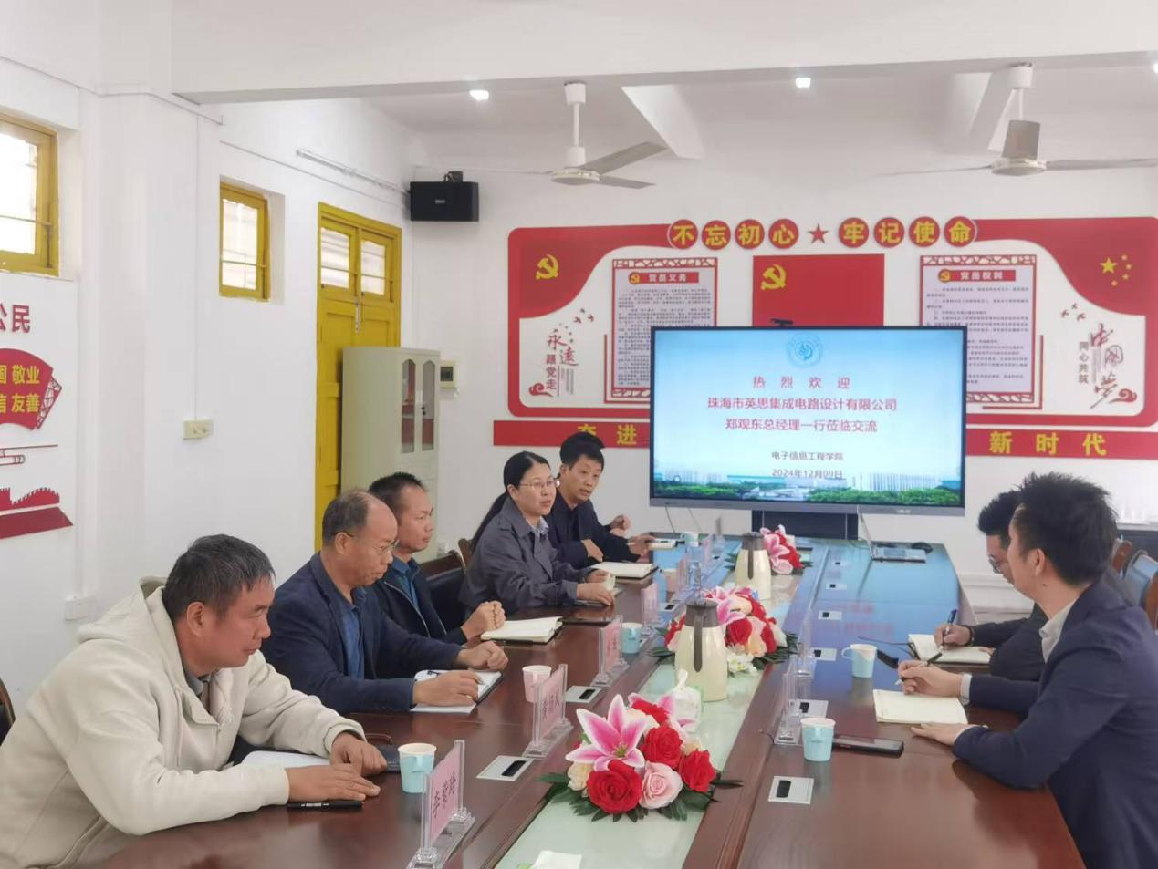 12月9日上午,珠海市英思集成电路设计公司总经理郑观东率队访问电信学院,旨在深化校企合作,探索产教融合新路径。学院党委书记李添、院长张磊、系主任及骨干教师参加座谈会议,会议由副院长杨艳主持。