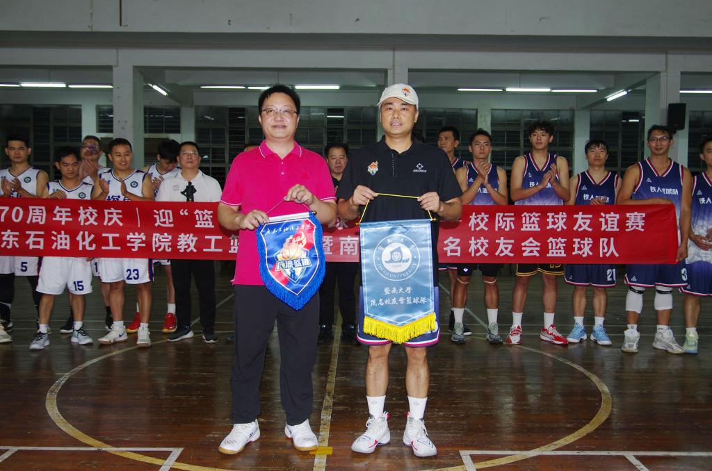 七十载春华秋实,七十载风雨兼程,七十载砥砺奋进,广东石油化工学院迎来了70 岁生日。值此欢庆之际,广东石油化工学院教工篮协主办的迎“篮”而上,追“球”卓越------校际篮球系列友谊赛于10月30日晚上,在官渡校区体育馆正式拉开帷幕,首场比赛由暨南大学茂名校友会篮球队对阵广东石油化工学院教工篮协铁人篮球队,为全校师生带来了一场精彩绝伦的体育盛宴。暨南大学校友会副会长、茂名校友会会长杨春熙,暨南大学茂名校友会副会长、秘书长冯柏清,广东石油化工学院工会常务副主席李哲,广东石油化工学院教工篮协会长冯晓出席活动。