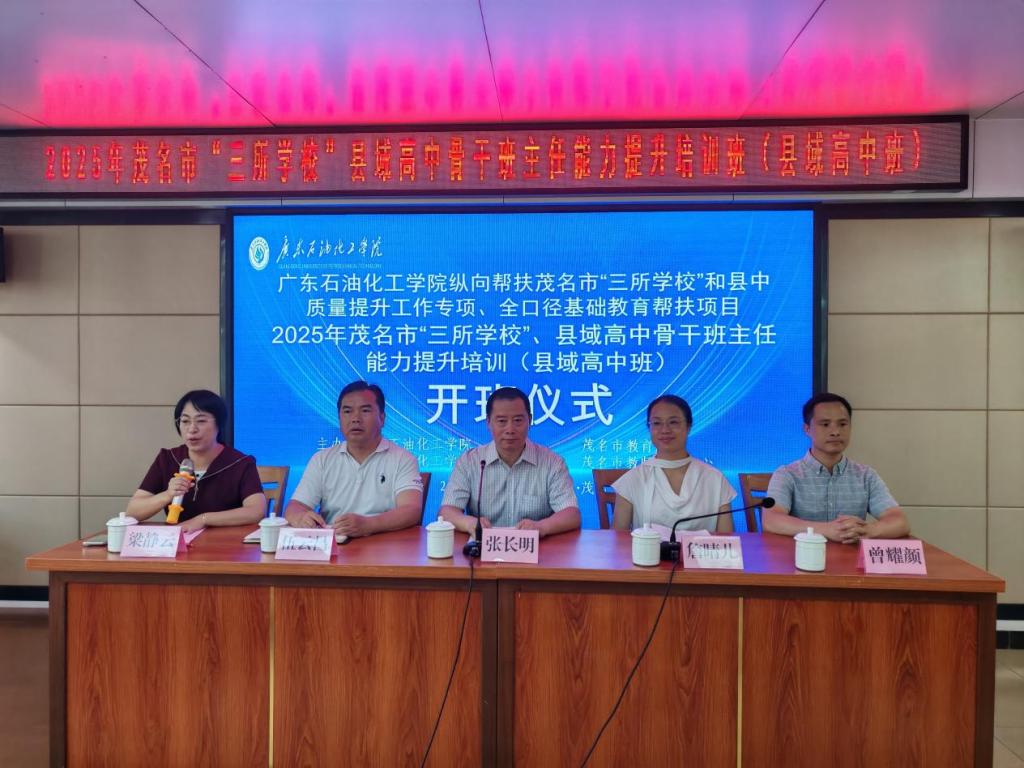 5月20日上午,广东石油化工学院纵向帮扶茂名市“三所学校”和县中质量提升工作专项、全口径基础教育帮扶暨2025年茂名市“三所学校”、县域高中骨干班主任能力提升培训(县域高中班)在茂名市教师发展中心三楼报告厅举行。此次活动由广东石油化工学院和茂名市教育局共同举办。学校继续教育学院院长张长明、茂名市教师发展中心副主任詹晴儿、名班主任工作室主持人及44名来自各县(市、区)乡镇的高中班主任参加开班仪式。