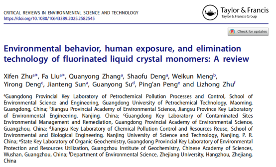 近日,广东石油化工学院环境科学与工程学院孙建腾教授团队在环境学科权威综述期刊Critical Reviews in Environmental Science and Technology(CREST)上发表了题为“Environmental behavior, human exposure, and elimination technology of fluorinated liquid crystal monomers: A review”的综述论文。朱锡芬博士为第一作者,学校首届硕士研究生刘发为共同第一作者,孙建腾教授为通讯作者。CREST是Taylor & Francis旗下创刊于1993年的综述类旗舰刊物,致力于发表环境科学、环境工程与技术、环境管理与政策等领域的全面、权威、批判性的综述文章,是国际环境领域具有重要影响力的学术期刊。2025年最新影响因子13.2,位于中科院1区TOP。