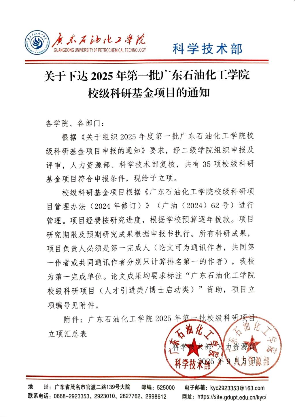 关于下达2025年第一批广东石油化工学院校级科研基金项目的通知