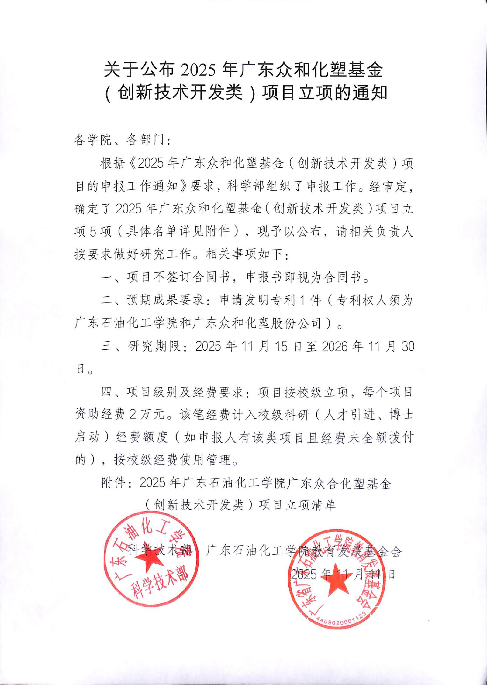 关于公布2025年广东众和化塑基金 (创新技术开发类)项目立项的通知
