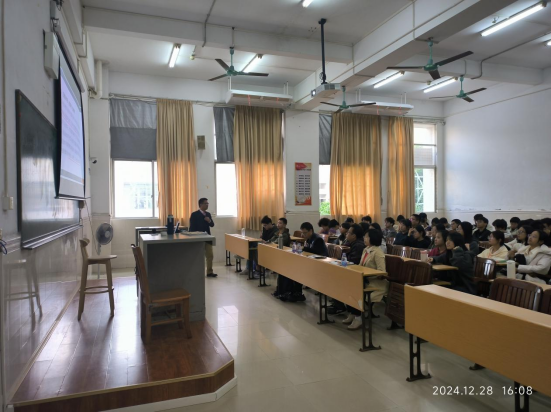 为助力数学教育师范生明确学习方向,提升数学教育专业素养,朝着卓越教师的目标迈进,理学院数学系于12月28日在二B202举行卓越教师系列活动之《新课程下数学教育本科师范生的学习建议》专题讲座。本次讲座由理学院数学系主办、广东省初等数学学会茂名办事处协办,邀请广东省第七批特支计划教学名师、广东省名教师工作室主持人,广东省首批中小学教师培训专家、高中数学正高级教师(三级)、广东省初等数学学会会长、高中数学三级正高级教师钟进均老师主讲,理学院副院长肖劲森、数学系主任伍思敏、副主任梁燕及近百名师范生参与。活动由理学院副院长肖劲森主持。
