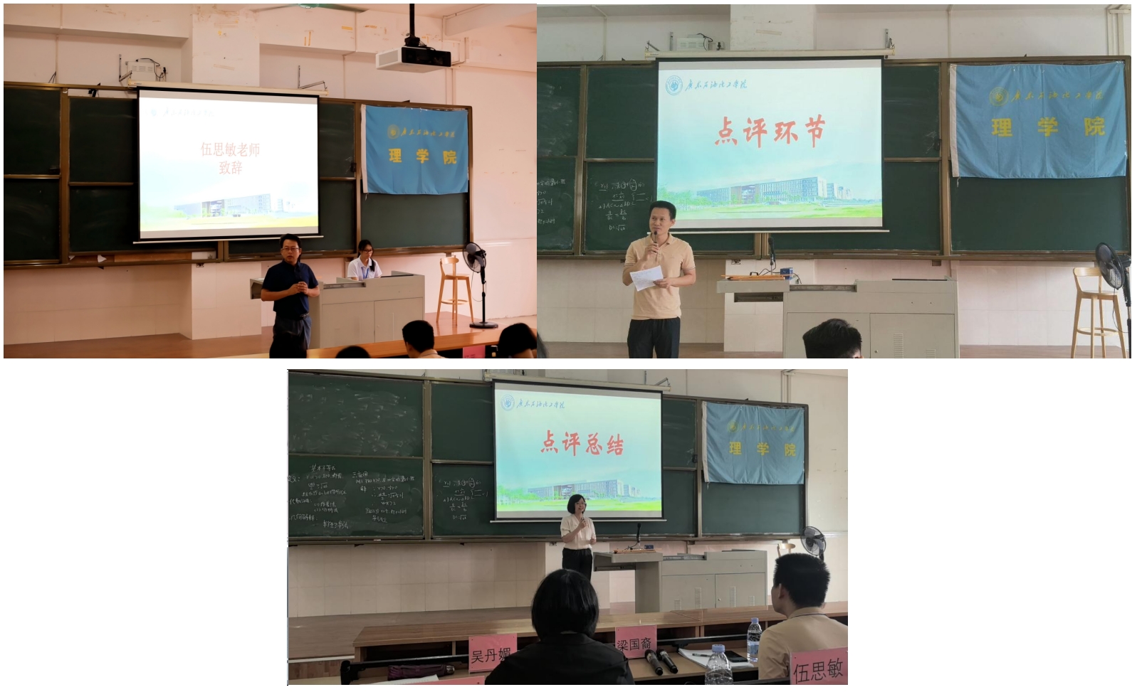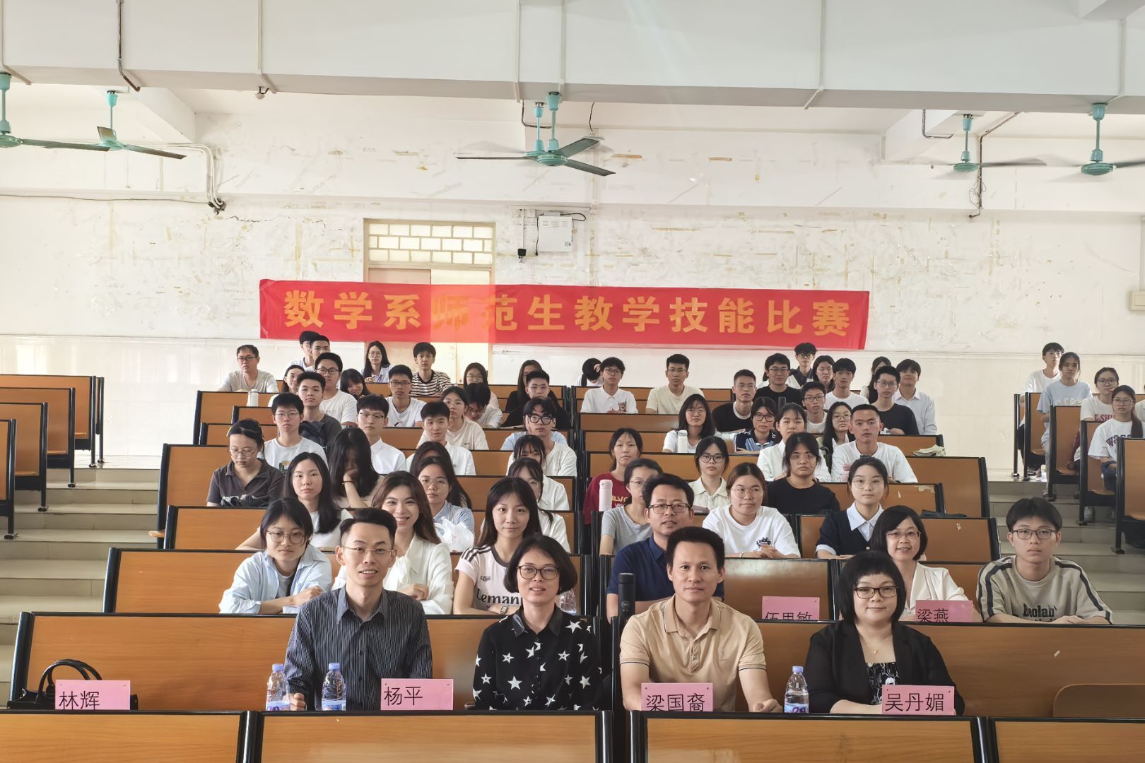 为加强师范生教学技能的培养与训练,切实提高师范生实践教学能力,我系于6月15日在2A301举行了理学院数学系第四届师范生教学技能决赛。本次比赛由理学院数学系主办,广东省初等数学学会茂名办事处、粤龙门教育培训中心、理学院素拓中心协办。茂名市教育局教育数学教研员、数学高级教师梁国裔老师,茂名市第一中学高中数学高级教师、数学科组长杨平老师,茂名市博雅中学初中数学高级教师、课程与教师发展中心负责人吴丹媚老师,粤龙门教育培训中心林辉校长担任大赛评委。数学系主任伍思敏老师、副主任梁燕老师及数学系师范生一百余人出席比赛。
