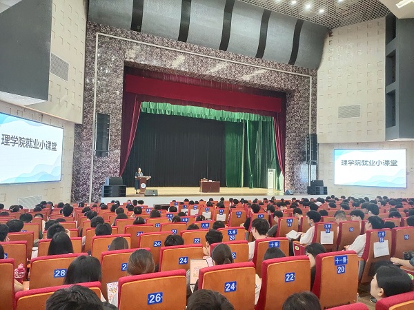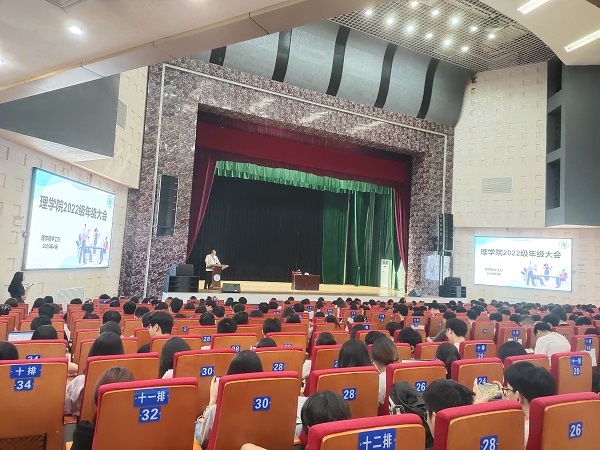 2025年4月24日晚,理学院在科技礼堂召开2022级年级大会,学院党委副书记符清桓、辅导员张智毅、钟书文以及全体22级学生参会。会议由张智毅主持,共计500多名学生参会。