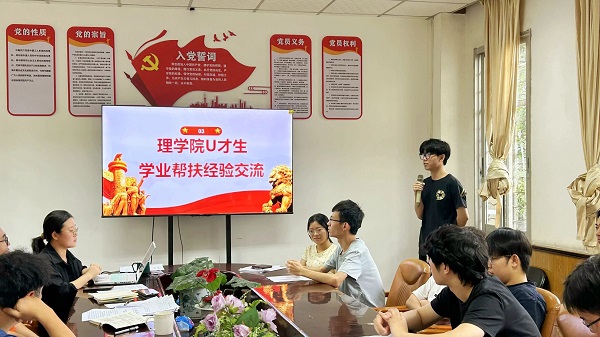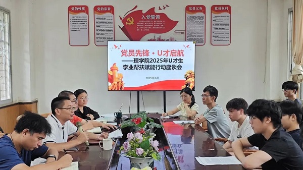 2025年6月17日上午,理学院在学院楼201会议室召开“党员先锋·U才启航”——2025年U才生学业帮扶赋能行动座谈会。学院党委副书记符清桓、年级辅导员、学业帮扶导生及党建学生干部出席座谈会,会议由辅导员钟书文主持。