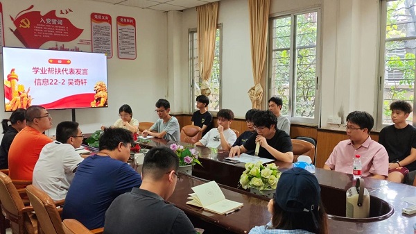 会上,钟书文老师详细介绍了“党建+学业”帮扶行动的背景、意义及具体实施方案。优秀学业导生代表信息22-2班吴奇轩分享了学业帮扶的实践经验:针对帮扶对象数学基础薄弱、多门课程不及格的情况,他探索出“生活切入建立信任—激发内驱变被动为主动—精准定制核心题型攻坚计划”的帮扶路径,并通过“朋友式沟通”、“线下共学”等方式,成功助力帮扶对象在多数课程上取得及格成绩,实现明显进步。