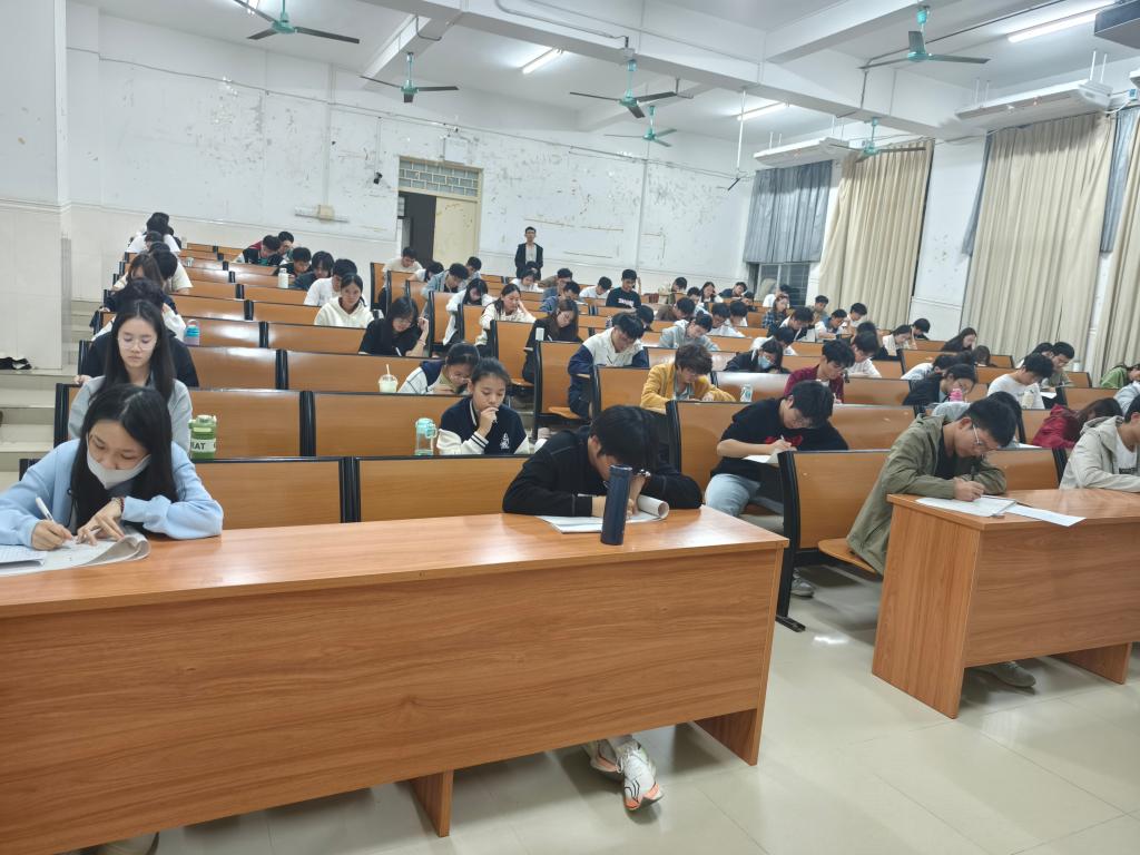 考试现场秩序井然,同学们全神贯注地投入到答题之中,时而奋笔疾书,时而低头沉思,展现出严谨认真的应考态度。