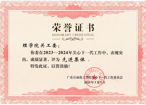 近日,理学院关工委在广东石油化工学院关心下一代两项重要的工作成果评选中脱颖而出,分别荣获 “读懂中国活动优秀组织奖” 与 “关心下一代工作先进集体奖”,这充分彰显了理学院关工委在相关工作中的突出贡献与卓越成效。