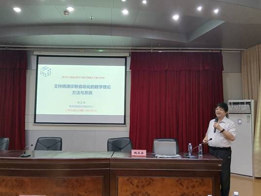 会议由林全文副院长主持,对到访人员表示热烈欢迎。随后,王一举教授对粤港澳国家应用数学中心的成立历史及研究方向及建设情况进行了介绍。粤港澳国家应用数学中心是经国家科技部公布成立的首批国家应用数学中心,是数学、统计学、计算机、企业和行业各界级数交流的高端平台,主要研究领域包括新一代信息技术、智能制造、海洋科学与天气预报、医疗健康、应用数学基础理论与科学计算,近两年来,中心获得了超7000万的经费支持,取得了丰硕的成果,也吸引了大批优秀的科研人员。随后,姚正安教授对中心正在研究的两个重点项目的研究内容、研究难点以及目前取得的成果就行了介绍和交流。数学与医疗健康交叉重点专项《支持病理诊断自动化的数学理论方法与系统》主要利用数学、统计和人工智能方法探讨病理微环境的转变机制。《天气海洋科学中的模式建立计算识别及应用》主要利用流体力学、计算热力学、数学建模、人工智能和大数据分析对短临天气进行预报。最后,林全文副院长对两位教授的精彩讲解表示感谢,并希望骨干教师能积极参与相关项目的申报,积极投身前沿科技研究。