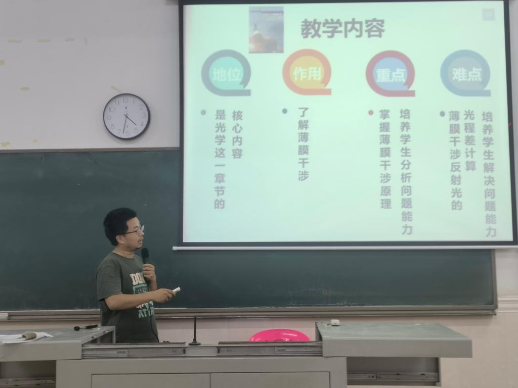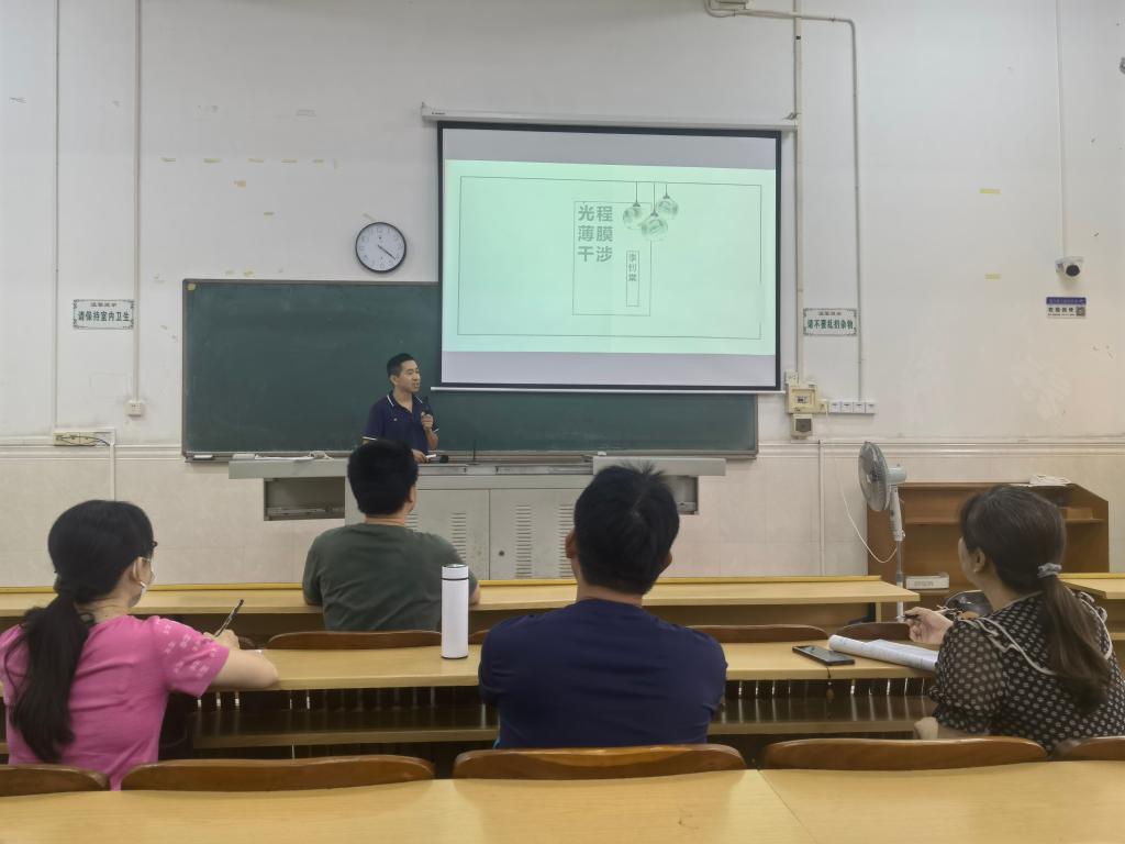 本次教研活动采用同课异构形式开展,主讲教师分别以《光的薄膜干涉》为主题进行了说课。参与说课的老师分别从从教学内容、学情分析、教学目标、教学方法、教学过程、思政融入等方面进行了精彩地阐述,既设计了丰富的教学互动情境,又联系生活和当前科技应用与前沿进展,同时体现了人与自然和谐统一,展现了自然美,充分挖掘课程的思政元素。说课结束,全体教师围绕说课主题从课程思政、教学内容、教学态度、教学方法和教学效果等方面进行了充分研讨。