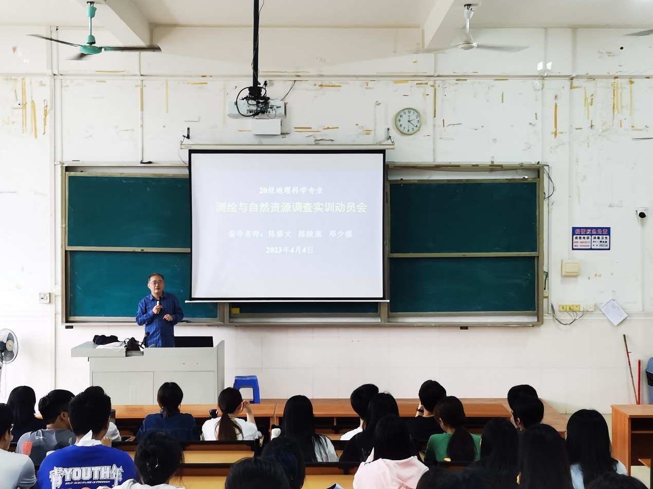 根据20级地理科学专业(非师)人才培养方案要求,在理论教学测量学、地图学、遥感概论学,地理信息系统、中国地理等课程学习后,安排为期二周的综合实训,旨在加强各专业课程之间有机联系,提升地理科学综合社会服务功能,培养学生熟练运用现代地理科学理论和方法解决实际问题的能力,具备业务过硬、高素质应用型复合人才培养目标的需求。在理学院梁根院长的大力支持下,地理科学系于2023年4月4日下午在二教A302教室召开了测绘与自然资源调查实训周动员会。会议由地理科学系主任陈修文教授主持,陈陵康副教授、邓少福博士20级53名同学参加。