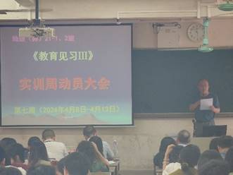 2024年3月27日下午,理学院地理科学教研室组织开展地理(师范)21级全体师范生的《教育见习Ⅱ(地理教学工作)》与《教育见习Ⅲ(地理教学技术综合训练)》动员大会。本次会议由朱哲主任主持,廖树峰老师主要负责动员宣讲和相关培训,其他老师补充发言。两大《教育见习》为期2周,对地理(师范)学生而言,它是十分重要的实践环节。在实践过程中,学生不仅能通过亲临现场观摩中学名师如何把控课堂、开展教学过程,习得弥足珍贵的临场经验;更能通过不断的模拟与自我修正,提升自己的课堂表现力及教学能力。会议议程及主要内容大致如下: