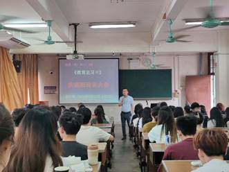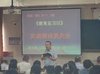 (2)围绕“如何开展教育见习,如何进行见习评价”等实践环节中的具体问题,廖树峰老师进行了详细的讲授和辅导,确保学生们理解整个实践流程和相应评价体系,勉励学生们认真准备、勇于挑战自我,努力为自己赢取“田家炳杯”全国师范院校师范生教学技能竞赛的参赛资格。