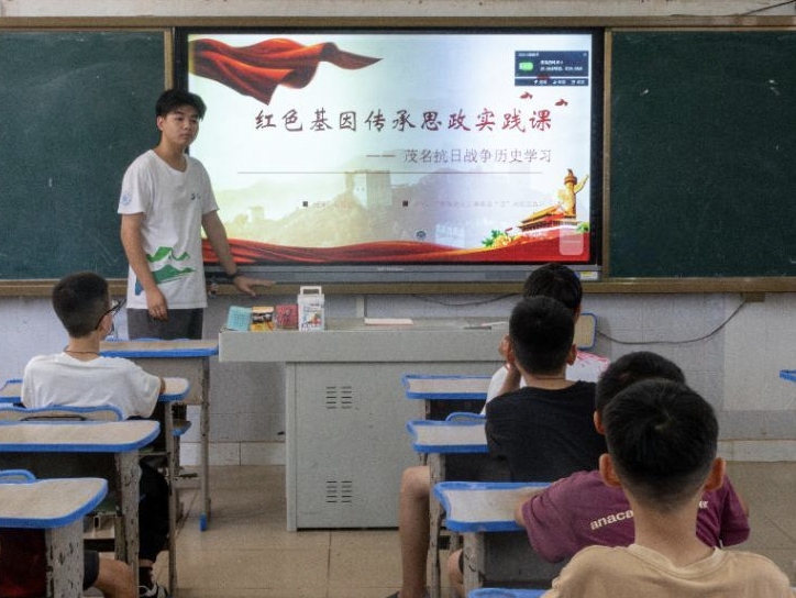 7月16日,为增强孩子们的家乡认同感和民族自豪感,益“启”兴农实践团精心打造了一节红色思政实践课。课程伊始,蔡昊宏老师用生动语言为孩子们勾勒出茂名城市的绚丽画卷,激发他们对家乡的真挚感情。历史学习环节,蔡昊宏老师将珍贵抗战史料片段与卡通视频巧妙结合,以童趣的方式清晰呈现了14年抗战脉络。同时,他重点讲述了南路革命文化、东江纵队的故事,并借助科技让孩子们与先烈进行跨越时空的对话,再现先烈事迹,引导孩子们为中华民族伟大复兴的中国梦贡献自己的力量。在后续的“心目中的英雄”活动中,孩子们踊跃分享抗日英雄的英勇事迹,爱国之情在心中悄然生长。