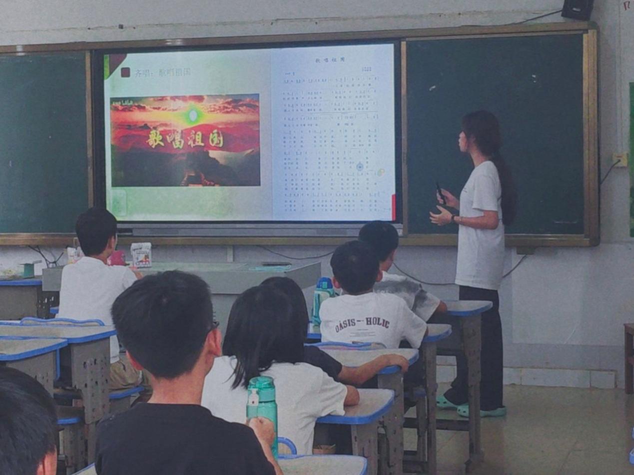 7月19日,广东石油化工学院百千万工程突击队益“启”兴农实践团特别开设了一堂爱国主题音乐课,旨在以音乐为媒,激发孩子们心中的爱国之情。课堂上,喻文贤老师给孩子们播放了《保卫黄河大合唱》《我和我的祖国》《歌唱祖国》等经典红色歌曲的视频。激昂的旋律、滚烫的歌词,带着孩子们一起回到了那段艰苦又壮阔的革命岁月,也让他们感受到了新时代的家国豪情。喻老师还逐句阐释了歌词背后的历史渊源,孩子们在跟唱的过程中,渐渐领会到歌曲中蕴含的赤诚之心。