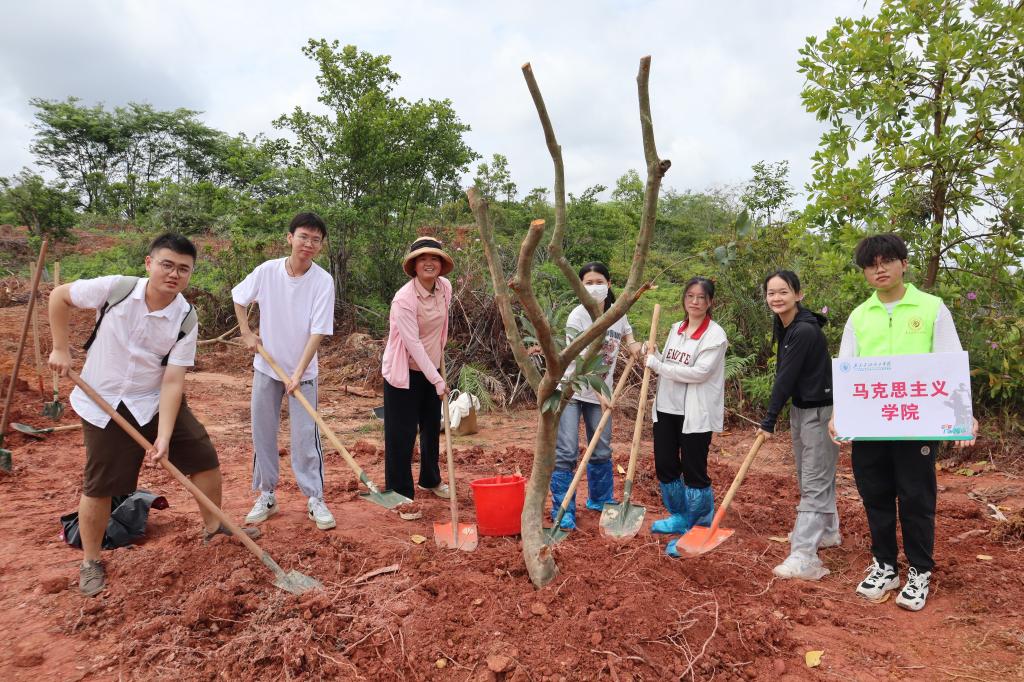 6月20日上午,在学校西城校区求实园,一场满含深情的植树活动温暖上演。思政(师)2025届本科毕业生在毕业前夕,为母校捐植一棵荔枝树,为校园增添一抹新绿,也种下了对母校的感恩与眷恋。学院党委书记田益民、副书记曾小梅、辅导员肖羽欢与毕业生代表共同参加了植树活动。
