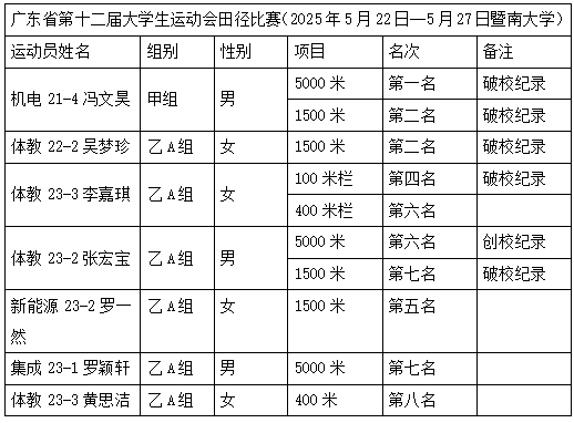 广东省第十二届大学生运动会田径比赛于2025年5月22日至27日在暨南大学(石牌校区)举行,来自全省139所高校的2600余名运动员参赛。我校田径队在领队苏广军,教练员刘鑫、刘健一的带领下,14名运动员参加了乙A组(体育专业组)和甲组(普通生组)的比赛。