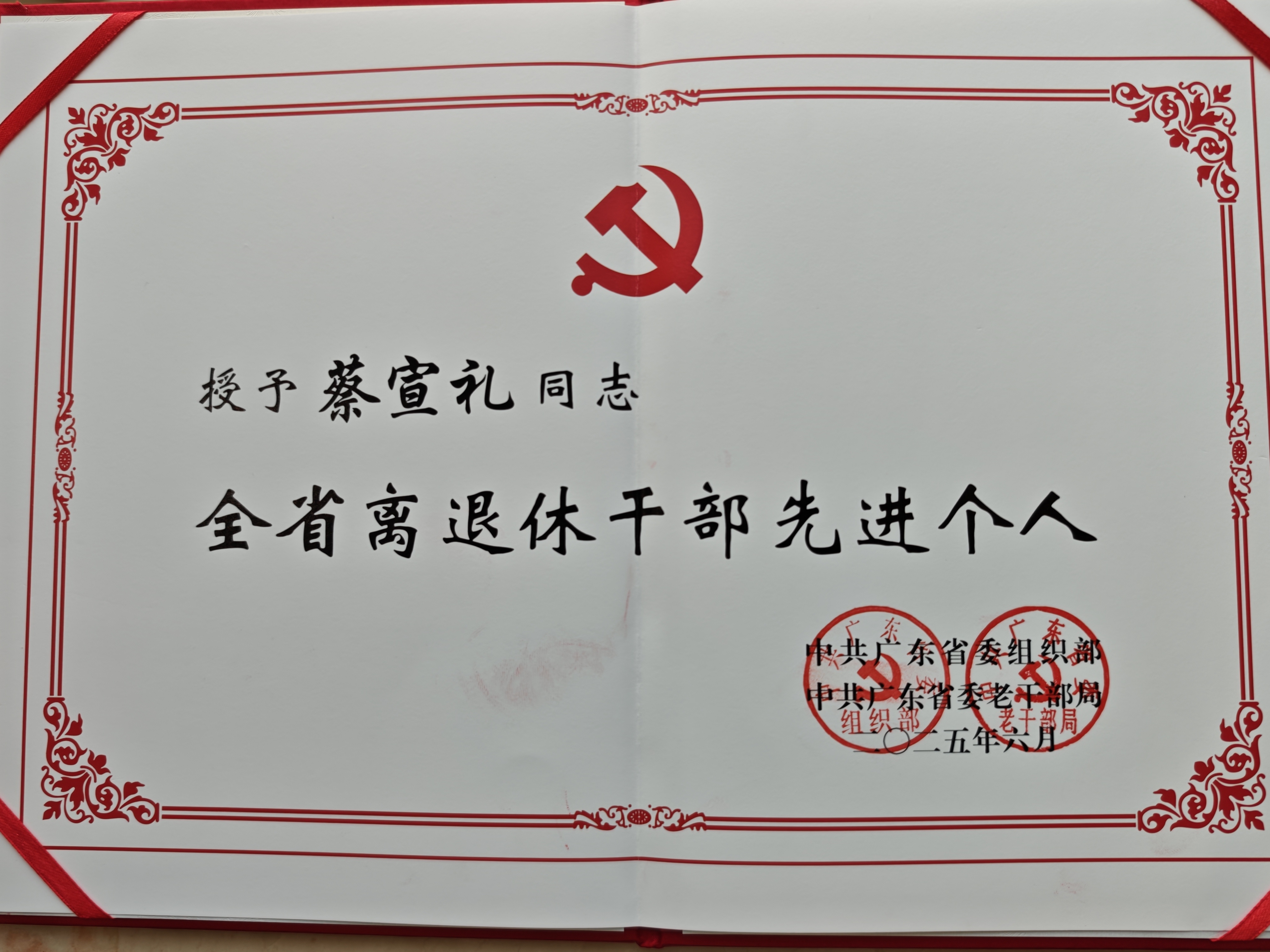 2025年6月6日,全省离退休干部先进集体和先进个人表彰大会在广州召开。学校离休干部蔡宣礼同志荣获“全省离退休干部先进个人”荣誉称号(省直单位共11人获此殊荣)。