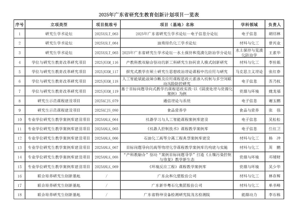 2025年6月27日,广东省教育厅发文(粤教研函〔2025〕1号)公布了2025年广东省研究生教育创新计划项目立项名单,学校18个项目获批立项。“2025年广东省研究生学术论坛—电子信息分论坛”等3个项目立项为2025年广东省研究生学术论坛,“产教科教双融合驱动的新工科研究生协同育人模式创新研究”等4个项目立项为2025年广东省学位与研究生教育改革研究生项目,“通信理论与系统”等2门课程立项为2025年广东省研究生课程建设项目,“机器学习与人工智能课程案例库建设”等6个项目立项为2025年广东省专业学位研究生教学案例库建设项目,“广东石油化工学院—广东众和化塑股份公司”等3个基地立项为2025年广东省联合培养研究生创新基地。