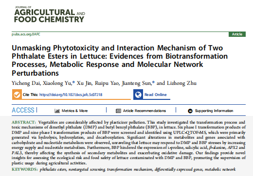 该研究聚焦农业生产中广泛使用的塑料大棚与地膜所带来的环境风险,以典型增塑剂酞酸酯(Phthalate Esters)为研究对象,系统揭示了其在生菜中的转化过程与毒性机制,成功鉴定出相关转化产物。通过整合非靶向代谢组学与转录组学分析,从分子层面阐明了酞酸酯及其转化产物对生菜代谢网络与基因表达的干扰机制。研究成果为科学评估酞酸酯类物质对蔬菜安全生产与食品安全的影响提供了新依据,对农业塑料污染管控和绿色农产品生产具有重要指导意义。