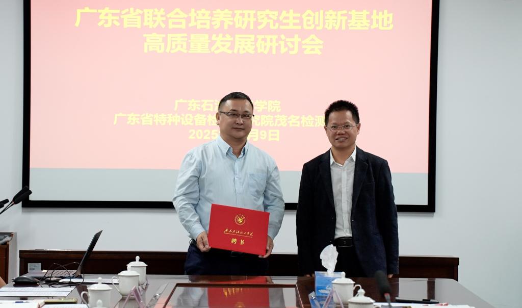 12月9日,广东石油化工学院—广东省特种设备检测研究院茂名检测院(以下简称茂名检测院)广东省研究生联合培养示范基地揭牌仪式在茂名检测院举行。学校党委常委、副校长万勇,茂名市市场监督管理局二级高级主任何金,茂名检测院副院长陈阮等双方单位领导、相关部门负责人、导师代表以及能源动力2025级全体研究生参加揭牌仪式。