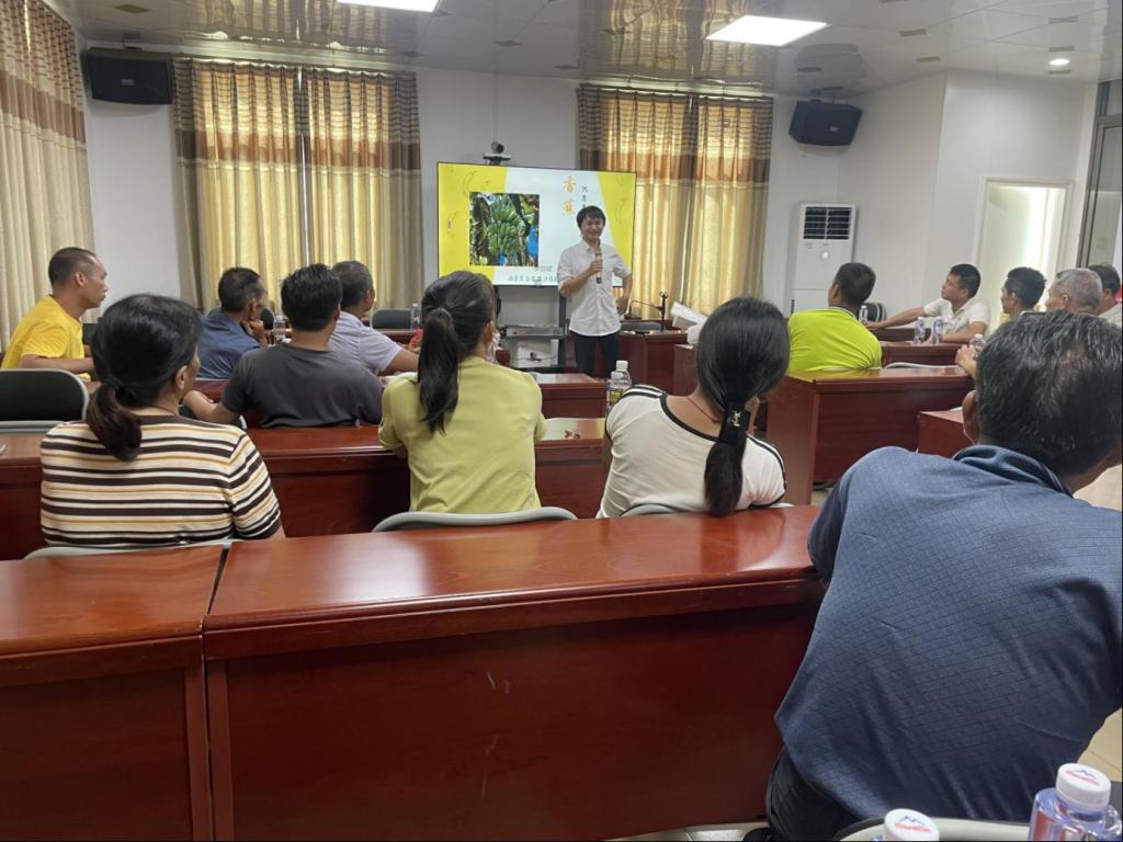 第二场培训由来自于广东茂名农林科技职业学院现代农业学院的罗剑斌院长为大家讲解香蕉优质高产栽培技术。他强调,徐闻县虽为植蕉老区,种植户经验较为丰富,但依然要密切关注香蕉枯萎病,可通过合理选择抗枯萎病香蕉品种、与韭菜轮作等方式增强对病害的抵抗能力;他图文并茂地详细介绍了香蕉的新品种、生长特性、水肥和花果管理技术要点,并结合多年工作经验向学员们介绍了耐风品种、植株营养管理、合理留芽、全园牵引互绑防倒伏等香蕉种植的科学防台风举措。