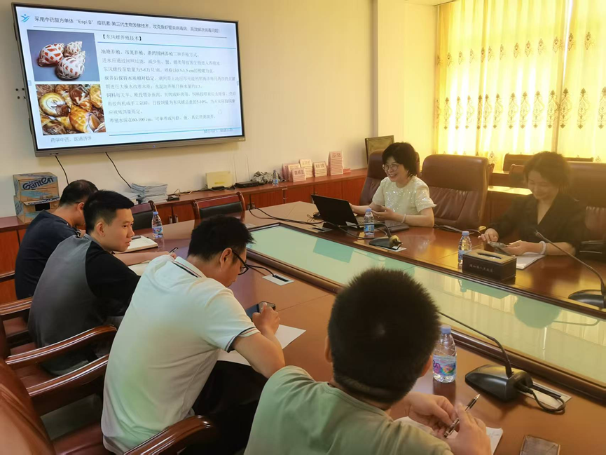 随后,孙巍基于团队多年的研究成果,向参会人员介绍了水产病害中药替抗防治技术和产品。她先从水产病害频发、抗生素滥用导致水产品安全问题严峻的行业现状切入,说明了推广应用中药替抗产品和技术的必要性;然后深入浅出的介绍了中药替抗技术的原理和价值,重点讲授了本团队研发的产品是以黄芪、板蓝根、大蒜素等天然中草药为原料,通过科学配伍制成饲料添加剂或水体改良剂,具有“防治病害+提升品质”的双重作用,其中中草药活性成分可增强水产品的免疫力、抑制病原菌繁殖、调节水体微生态、减少病害滋生,比抗生素更温和且无药残问题,从而阐明了技术的可行性;她还介绍了团队参与研发的针对水产动物细菌性肠炎的“替抗先锋”、针对对虾弧菌病的“弧菌必清”、抗病毒的“疫抗素”和抗真菌的“佰研安”等产品在第九届“创客广东”茂名市中小企业创新创业大赛暨第四届“创客茂名”大赛创业组获得三等奖、在第十二届“青创杯”广州青年创新创业大赛非在校青年赛创业大赛获得一等奖、在第九届“创客广东”江门市中小企业创新创业大赛暨“创客江门”大赛创业组获得二等奖,并且已经实现了量产和市场化销售,目前已在阳江、江门、茂名等地开展了大规模的推广应用,市场反馈良好。因此,希望在乡镇领导和工作队同志的协助下能尽快在锦和镇开展推广工作,以助力学校结对徐闻县“双百行动”工作强化科技成果转化效应。