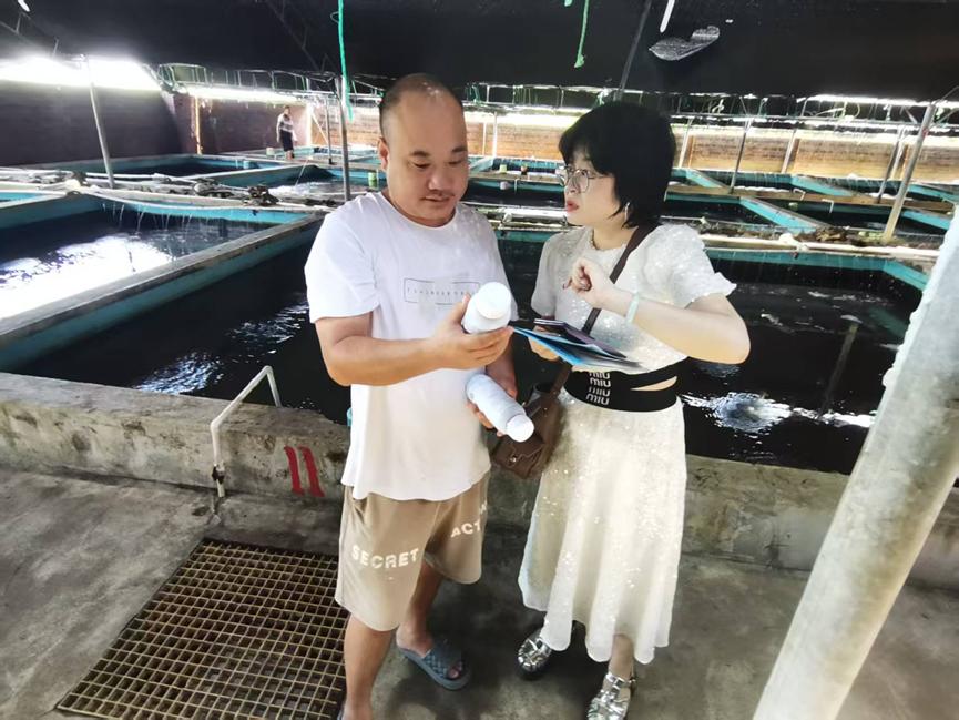 会后,在乡镇干部陪同下,张玲一行来到了白茅村两处东风螺养殖基地,向基地负责人详细了解了东风螺养殖现状和技术难题,并推介了中药替抗技术,赠送了一批产品,与负责人达成了“先试用后付费”的成果转化模式意向。