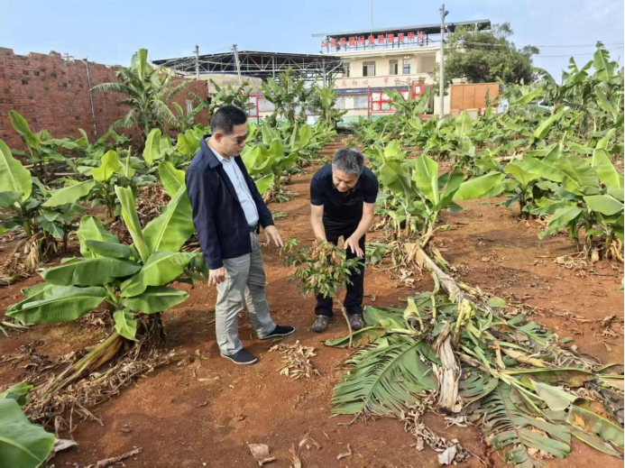 当日下午,符恩瑞委员、梁绍柏主任与陆光远教授一同赴加乐园村,实地察看了校地共建的早熟荔枝种植示范园。陆光远教授认为目前荔枝整体长势良好,但园内套种的香蕉植株高大,已对荔枝幼苗生长产生了遮光争肥等不利影响,加之当地台风频发,若香蕉倒伏将对荔枝造成风险。他建议将香蕉改种为蔬菜或玉米等短季节作物,既可减少对荔枝的干扰,又能提高土地利用效率和综合效益。