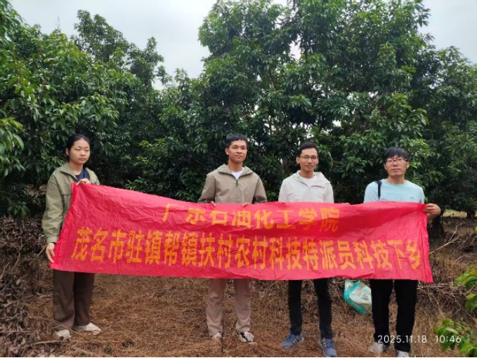 当前正值荔枝冬梢防控关键期,为帮助种植企业科学应对冬梢对次年挂果的影响,广东石油化工学院生物与食品工程学院驻茂名高州市金山街道农村科技特派员区晓阳博士和赵永国博士带领团队于2025年11月18日专程前往辖区内的茂名市众润农业科技发展有限公司荔枝种植基地,为农技人员开展荔枝“控梢促壮”技术指导,为企业送上定制化管理方案。