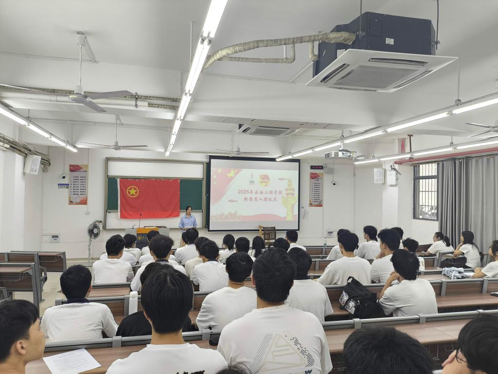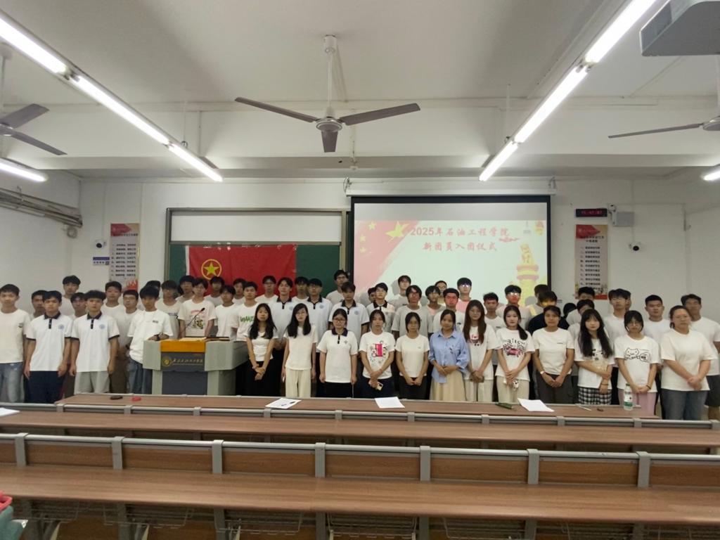 5月25日下午,石油工程学院团委在西城校区综合楼J05举行入团仪式暨专题团课。2025年上半年计划发展的63名团员参加仪式。仪式在庄严的国歌声中拉开帷幕。随后,学院团委副书记黄晓艳为新团员颁发团员证并佩戴团徽。领誓人易璐带领新团员们面向团旗高举右拳宣誓,誓言铿锵,目光如炬。