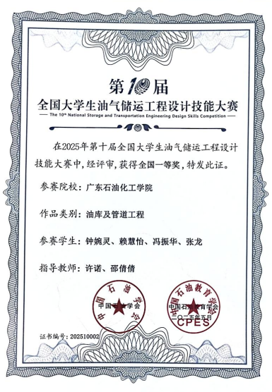 全国大学生油气储运工程设计技能大赛全国一等奖证书