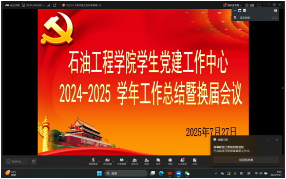 7月27日上午,石油工程学院学生党建工作中心(以下简称“党建中心”)在线上召开2024-2025学年工作总结暨换届会议,党建中心主席团成员、各部门部长参加会议,会议由学院副处级组织员张亮主持。