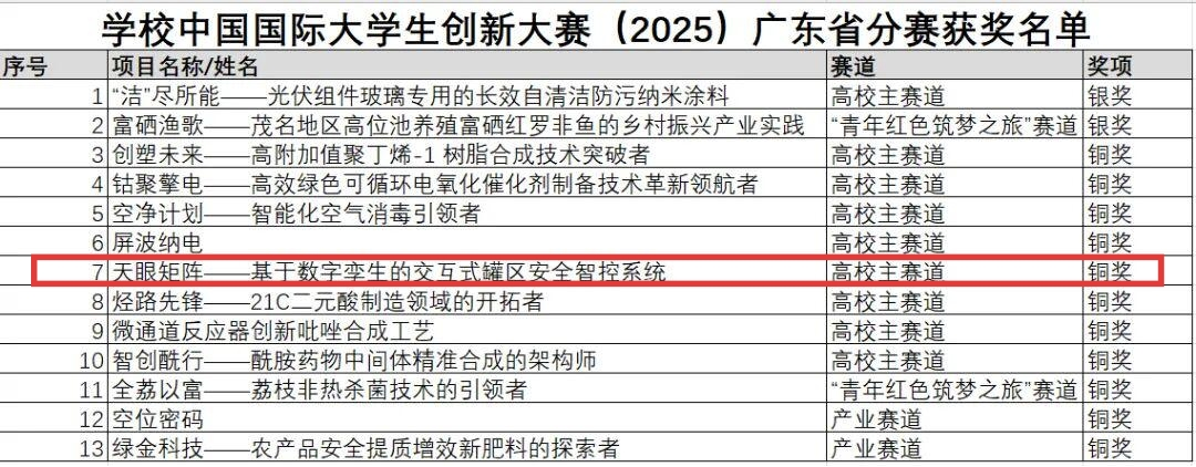 学校中国国际大学生创新大赛(2025)广东省分赛获奖名单