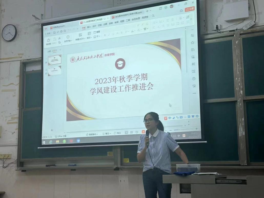 为确保体育学院学风建设工作高效落实,体育学院于11月3日晚上19点30分在二教A205上召开了学风建设工作推进会。体育学院副院长侯典云、党委副书记曾彩路、年级辅导员梁宵、杨峣、各班级班主任、各班级班干部、宿舍代表、2023级全体同学参加了会议。