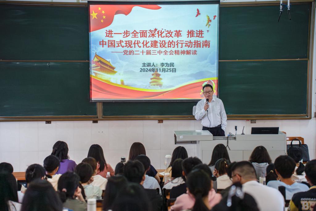 校领导以《进一步全面深化改革推进中国式现代化建设的行动指南——党的二十届三中全会精神解读》为题,围绕“党的二十届三中全会的重大意义和主题”、“进一步全面深化改革的总体思路与系统部署”、“进一步全面深化经济体制改革的重点方向”、“提高党对进一步全面深化改革的领导水平”四个方面,紧密结合当前国内外形势,深入讲解了党的二十届三中全会精神的深刻内涵与实践价值。同时,校领导对学生们提出殷切期望,鼓励他们作为新时代的青年学子,要坚定理想信念,积极投身实践,为进一步全面深化改革的伟大事业贡献青春力量。