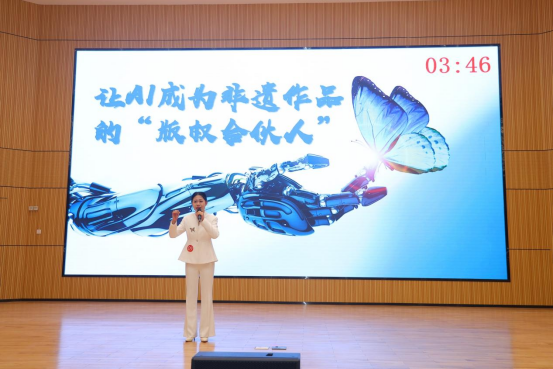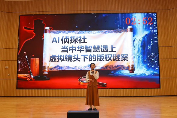 本届大赛以“版权护航创新,AI智启未来”为主题,采用个人现场演讲形式,选手需在5分钟内围绕大赛主题展开演讲。彭依敏同学以《AI侦探社:当中华智慧遇上虚拟镜头下的版权谜案》为题,通过生动的案例和严密的逻辑,展现了人工智能时代版权保护的前沿思考;唐艺恩同学以《让AI成为非遗作品的“版权合伙人”》为题,以其独特的视角和富有感染力的表达,探讨了非遗作品在数字时代的版权保护新路径。两位同学的演讲在指导老师的精心栽培下,既体现了扎实的专业功底,又展现了创新思维,获得了评委的一致好评。