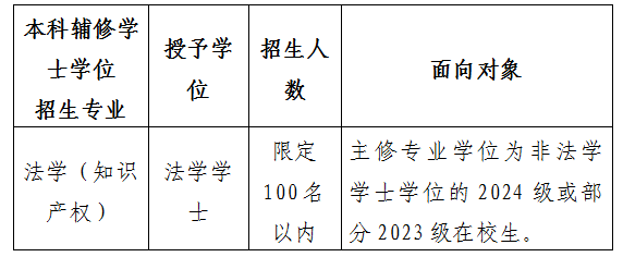 为满足社会发展对知识产权专业人才的需求,促进学科间的交叉渗透,培养高素质复合型人才,拓宽我校本科毕业生就业口径,增强就业竞争力,文法学院现开展法学(知识产权)本科辅修学士学位教育的招生工作。