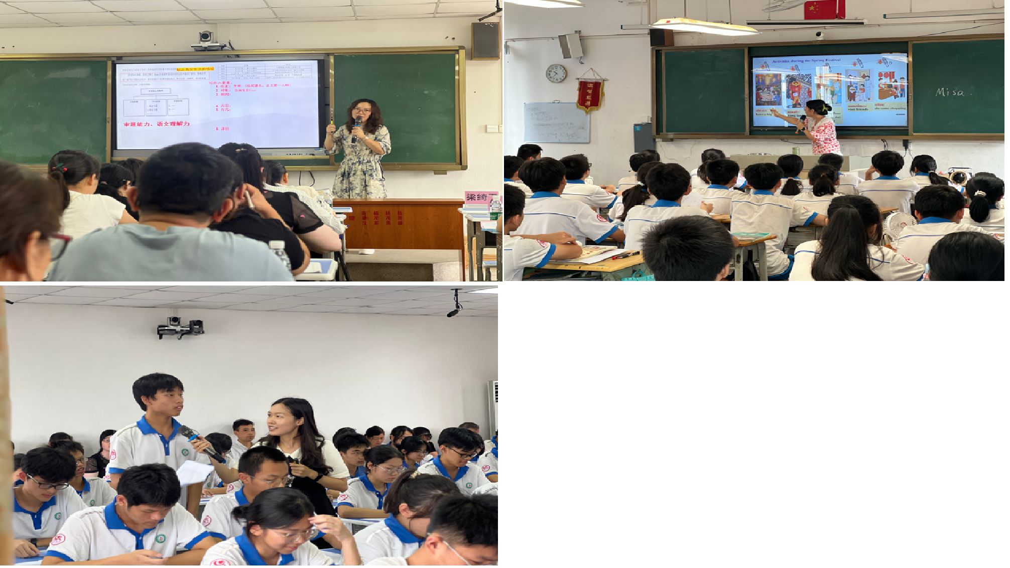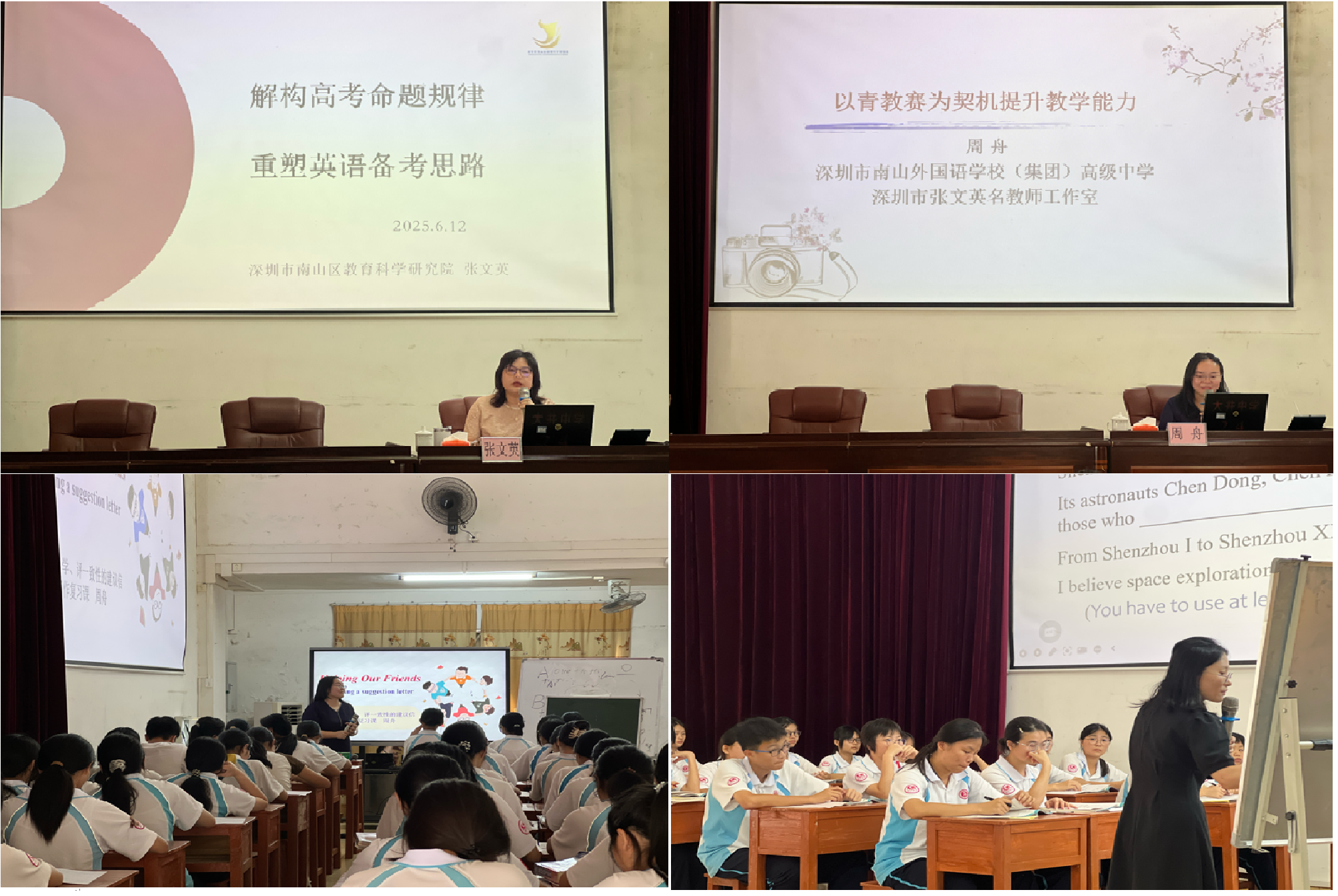 赋能一:解构高考命题规律,重塑教学思路。在高州市大井中学,深圳市南山区教科院高中英语教研员张文英教授应邀作了题为《解构高考命题规律,重塑英语备考思路》的主题讲座,她以近三年高考真题为例,分析了英语新课标实施以来高考评价体系实现的命题变革及命题规律,解析语篇选材中科技主题占比提升、中国传统文化题材强化等趋势,建议教师以主题为引领整合教材,通过深度阅读培养学生的语篇逻辑分析能力。全国青教赛一等奖得主周舟则以《以青教赛为契机提升教学能力》为题,提出 “教-学-评” 一体化设计路径,强调通过情境创设与跨学科融合提升学生英语综合运用能力。广东实验中学附属茂名学校高中英语教师许文舒老师和深圳市南山外国语学校(集团)高级中学英语教师周舟和分别以高一必修三阶段性复习课和建议信为主题进行了示范课。