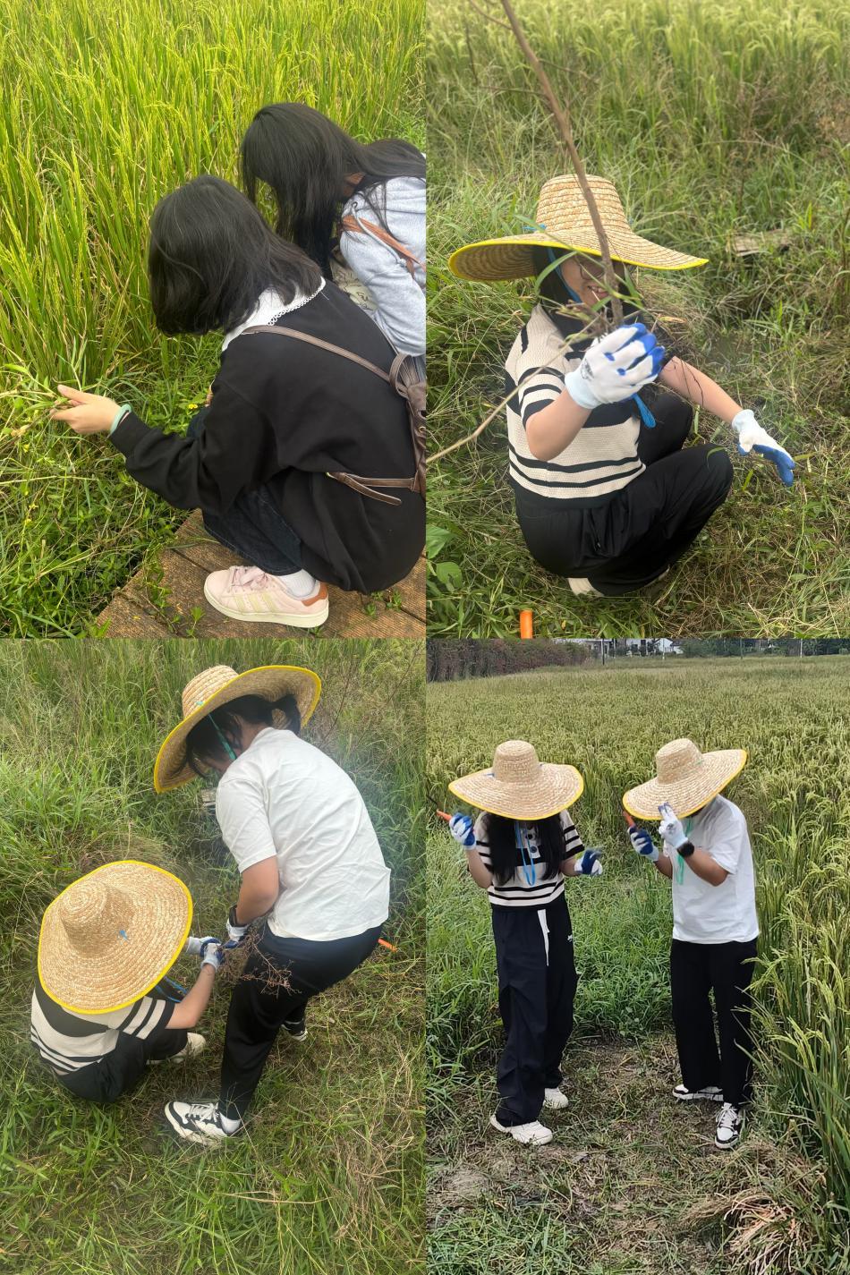 抵达基地后,实践基地指导老师先为同学们发放手套、帽子等防护与劳动工具,结合现场田垄情况,讲解水稻田周边杂草的种类辨别要点、不同杂草的拔除手法,以及避免损伤作物根系的注意事项;苏丹丹老师划分各班前往不同劳作区域,再次强调田间行走安全与工具使用规范。随后,同学们迅速以小组为单位投入劳作:有的蹲在田埂边仔细清理浅层杂草,有的借助小铲子挖除扎根较深的杂草,有的则及时将清理好的杂草归拢搬运至指定堆放点。虽秋日阳光仍有暖意,部分同学劳作后衣衫微湿,但大家始终相互配合、干劲十足,最终高质量完成了划定区域的除草任务,田间作物生长环境得到有效改善。