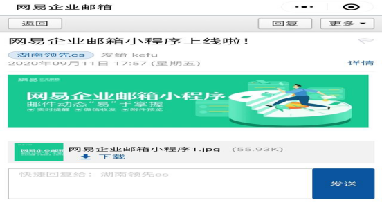 通过微信端点击新邮件即可查看自己的邮件信息,也可以直接在小程序端做快速回复,让你随时随地轻松办公。