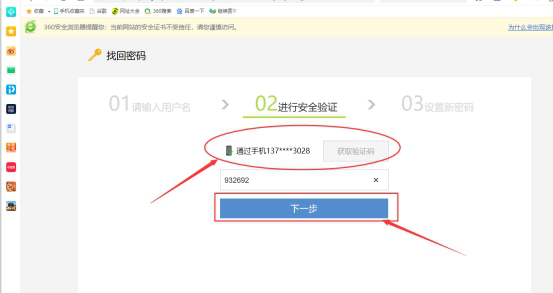 进入安全验证码界面,通过提交申请开通VPN时绑定的手机号码获取验证码(早期开通VPN账号没有绑定手机号码,如果需要绑定号码可以致电网信中心(2923790)蔡老师帮忙重置),然后输入收到的验收码,点击下一步,如下图四。