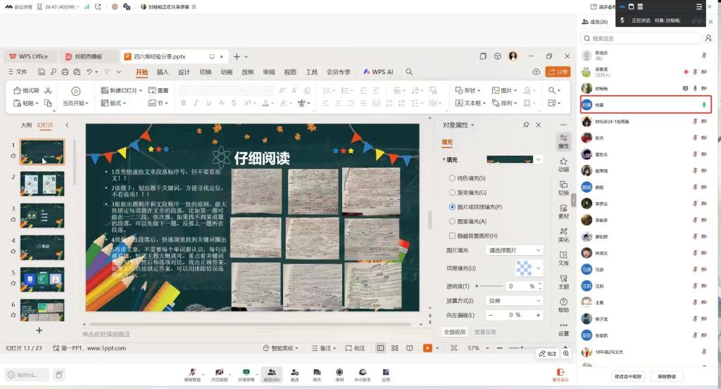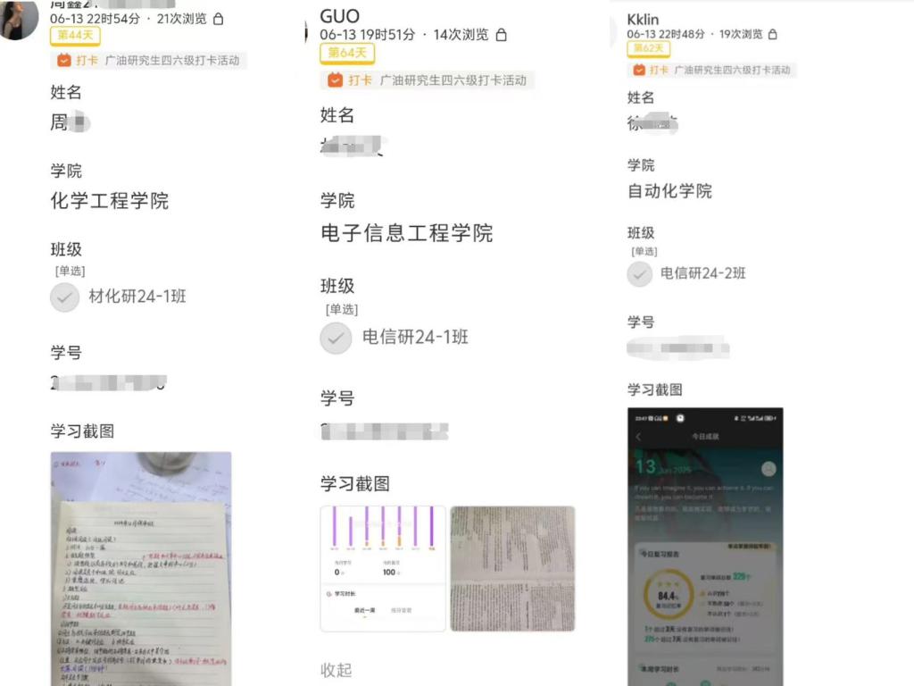 本次活动由“线上打卡”与“四六级通关分享会”组成。“线上打卡”利用微信“小打卡”小程序,通过每日学习任务培养同学们的学习习惯,分模块强化单词、阅读、写作及翻译训练,并设立激励机制鼓励坚持参与。“四六级通关分享会”邀请高分通过四六级的时畅畅同学系统讲解词汇积累、听力训练、阅读技巧及写作表达等备考策略和经验。研究生同学们表示,本次活动加强了研究生们之间的良性互动,激励他们通过可视化的目标养成了备考英语的良好习惯。
