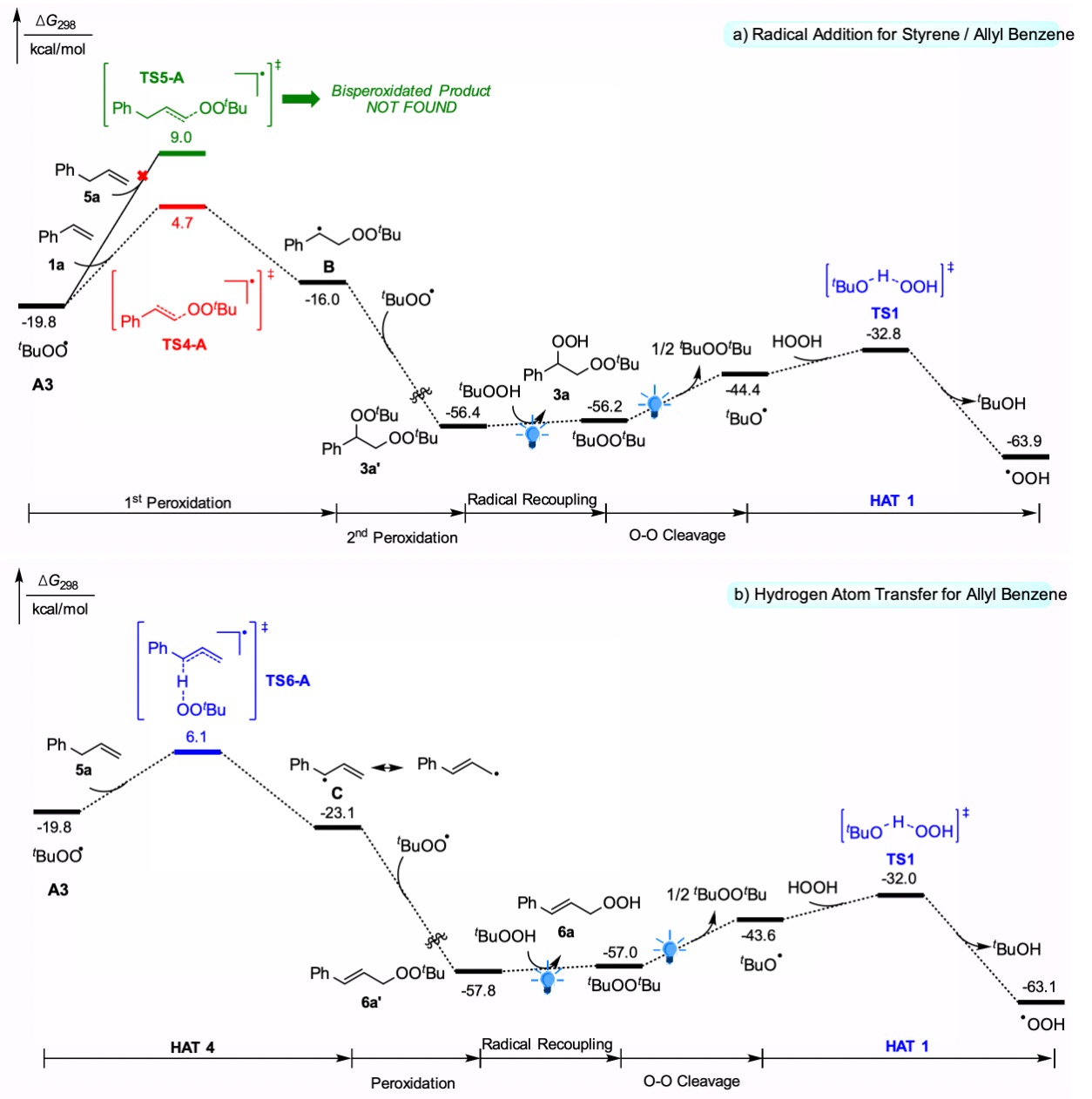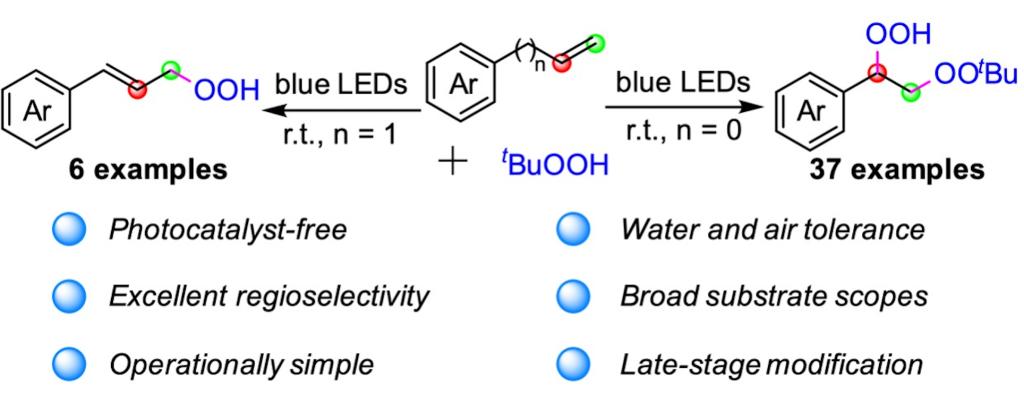 该研究论文利用可见光驱动,在无光催化剂参与的条件下,报道了一种芳基烯烃与叔丁基过氧化氢(TBHP)的双过氧化反应,并实现了α,β-双过氧化物的区域选择性合成。这是首次利用TBHP同时作为叔丁过氧基和氢过氧基双功能自由基源的自由基反应。此外,当以烯丙基苯类烷基烯烃为反应底物时,可获得烯丙基取代的过氧醇类产物。此研究所发展的TBHP-烯烃过氧化体系,可为氟比洛芬、布洛芬等药物的后期官能团化的合成与修饰以及功能材料的绿色合成提供系统性指导。